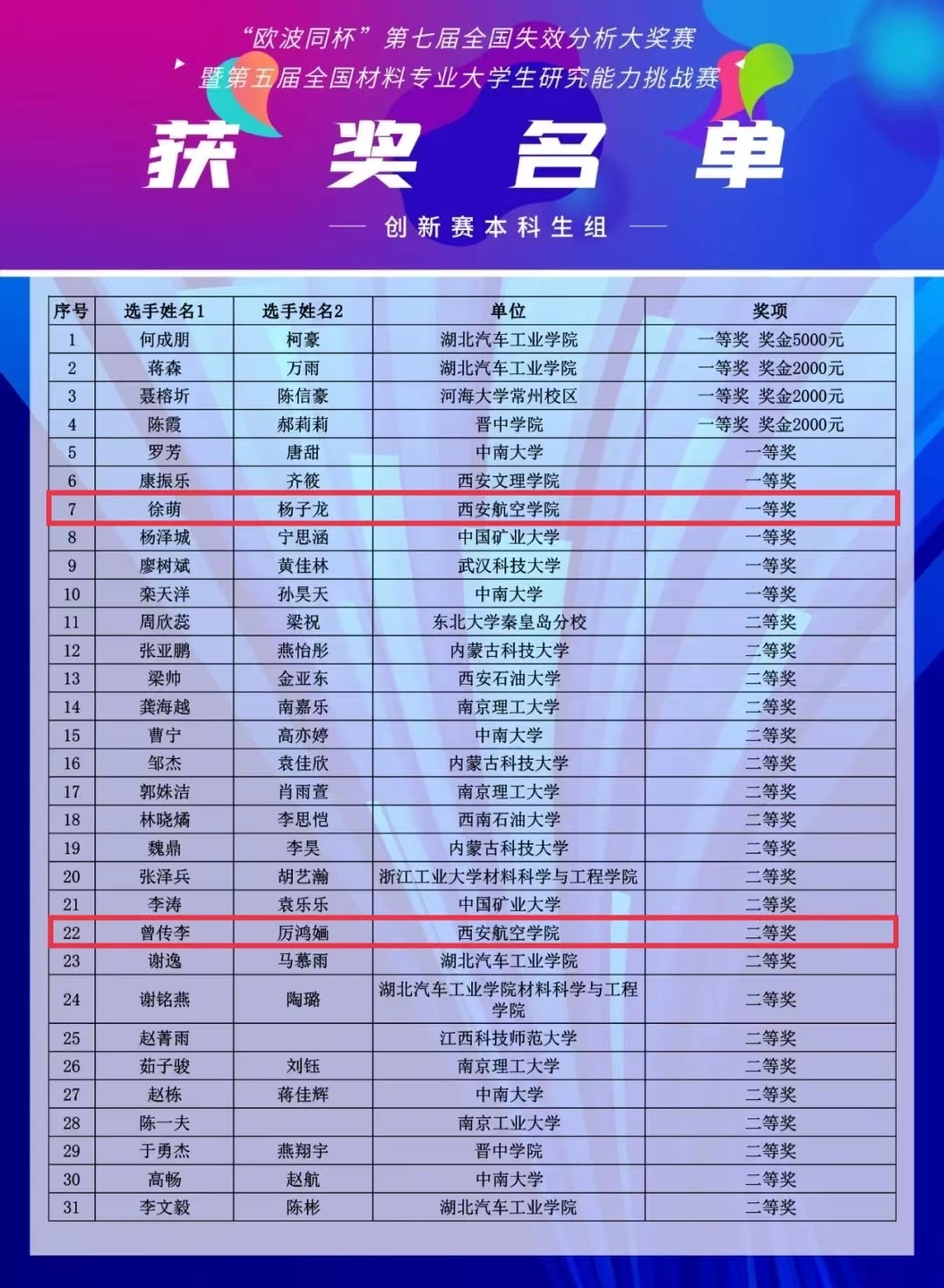 Beat365官网参赛选手围绕工程实践出现的材料失效难题,在老师的指导下开展了大量研究性实验,阐明了材料失效机制并提出解决方案。最终,在创新赛组中,唐健江老师和张海鸿老师指导徐萌同学、杨子龙同学获得了本科生组一等奖,邓新科老师和张龙老师指导的曾传李同学、厉鸿婳同学获得了本科生组二等奖。