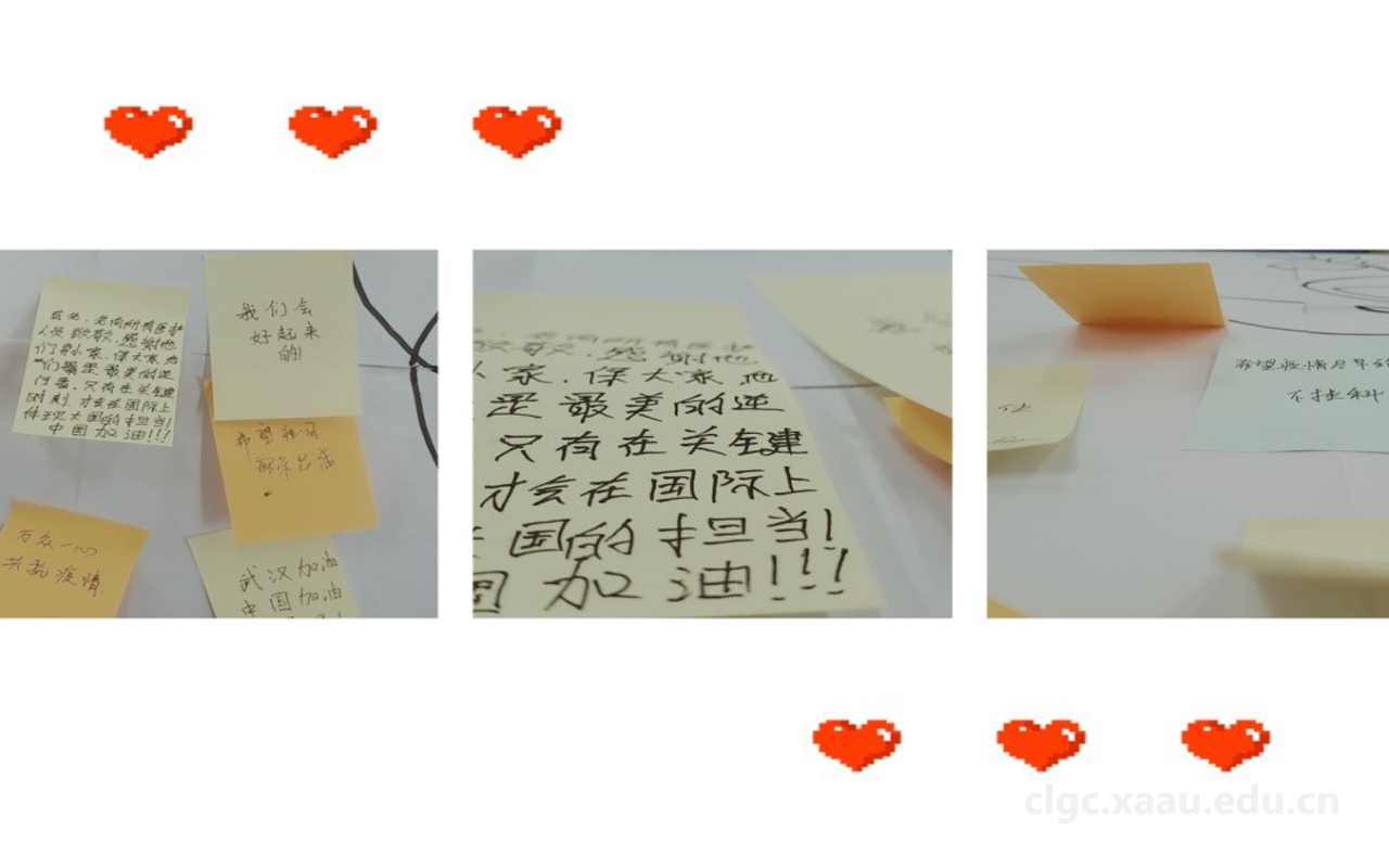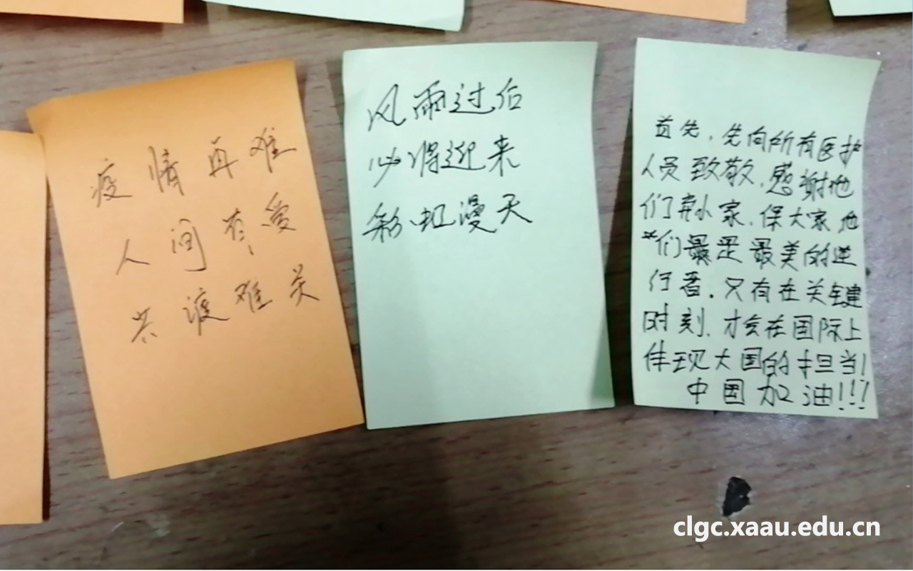 同学们在热烈的讨论过后积极参与活动纷纷写下了大家对疫情的祝福与期望。短短的祝福语蕴涵了同学们对“逆行者”们的尊重,对感染者的祈愿,对国家疫情发展的祝愿。体现了国难当头同学们团结抗疫的决心。在声声的祝福与祈愿里,我们感受到了同学们对国家的担忧,这也正体现了我们西航学子有着愿意担当的精神,忧国家之忧。国难当头,尽自己所能分担压力。