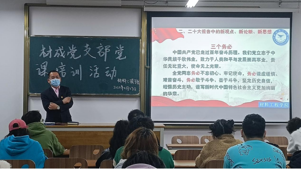 为了贯彻落实党的二十大精神,增强新时代大学生的责任感和使命感。11月27至29日,Beat365唯一官方网站党总支书记周华为材成、材科、复材三个学生党支部在4309教室召开题为“学习贯彻党的二十大精神,肩负新时代新征程的使命”的专题党课培训会,各支部全体党员、积极分子参加了培训会。