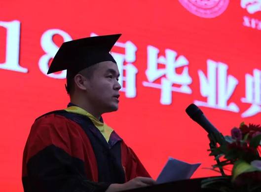 第四项,教师代表李兆副教授发言。李老师希望毕业生们珍惜大学四年的美好回忆,带着学到的知识本领自己人生道路上走向辉煌。这既是毕业也是开学,毕业生们就要从学校毕业,走上社会的学习大环境,希望毕业生们保持自信、自立、创新的积极心态。今后时光,行万里仍不忘母校。