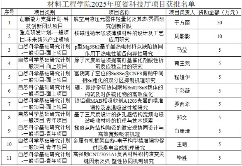 近日,陕西省科技厅2025年度科研项目立项结果正式公布,Beat365唯一官方网站喜获佳绩,共获批项目11项,占全校立项总数的三分之一,创历史新高。此次立项不仅包含全校首个“科技创新团队项目”,还涵盖1项重点研发计划及10项自然科学基础研究项目(含6项面上项目、4项青年项目),覆盖航空材料、纳米技术、能源催化等前沿领域,标志着学院科研水平全面提升,为学科建设与学校发展注入强劲动能。