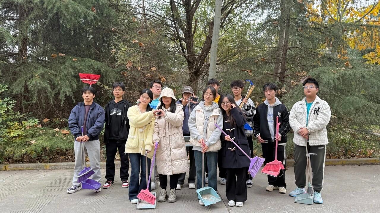 志愿者分为两组开展工作:一组负责图书馆旁道路,这里落叶较厚且夹杂少量零食袋、纸巾,大家手持扫帚挨着清扫,扫拢后及时装入袋子转运;另一组负责教学楼周边步道,这里落叶多散在路边、台阶旁,还夹杂零星杂物,志愿者逐段清扫,遇吹入草丛的落叶,弯腰逐一清理。