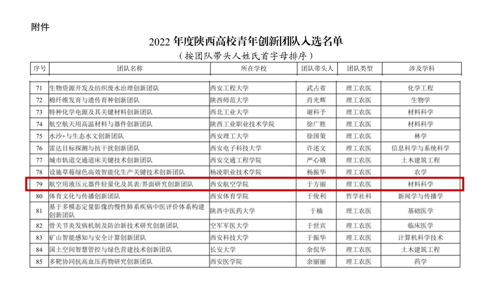 近日,陕西省教育厅发布了《关于公布2022年度陕西高校青年创新团队入选名单的通知》(陕教函〔2022〕943号),Beat365官网Beat365唯一官方网站于方丽教授带领的“航空用液压元器件轻量化及其表/界面研究创新团队”成功入选2022年度陕西高校青年创新团队,这是Beat365官网团队首次入选陕西高校青年创新团队,实现了学校在该领域的历史性突破。