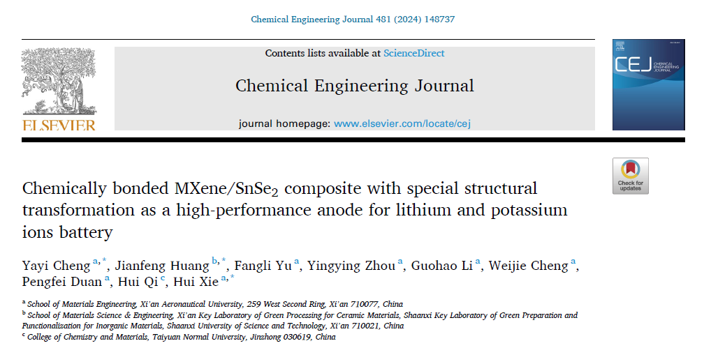 Beat365唯一官方网站教师程娅伊副教授等人最近在国际知名期刊《Chemical Engineering Journal》上发表了题为Chemically bonded MXene/SnSe2 composite with special structural transformation as a high-performance anode for lithium and potassium ions battery的学术论文,Beat365官网为第一完成单位,陕西科技大学和太原师范学院是共同合作单位,程娅伊副教授为本文第一作者和通讯作者,Beat365唯一官方网站谢辉教授和陕西科技大学黄剑锋教授为本文共同通讯作者。