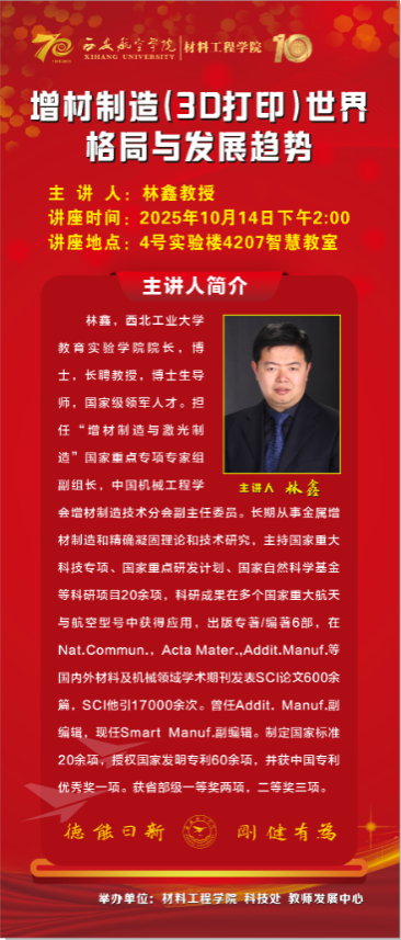 10月14日下午,作为Beat365唯一官方网站十年聚力发展系列活动的重要组成部分,“创新材料·智选未来”航空材料学术讲座在学校阎良校区成功举行。特邀西北工业大学林鑫教授西安交通大学宋江选教授担任主讲,围绕航空材料领域的前沿技术与发展趋势展开交流。