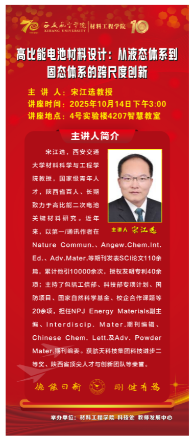 宋江选教授作了题为《高比能电池材料设计:从液态体系到固态体系的跨尺度创新》的学术分享“双碳”战略与能源安全需求出发,指出了发展高比能、长寿命、高安全储能体系的紧迫性重点介绍了其团队在水系有机液流电池、高容量锂金属电池等体系中的创新成果,为航空器动力电源的创新研发提供了重要思路。